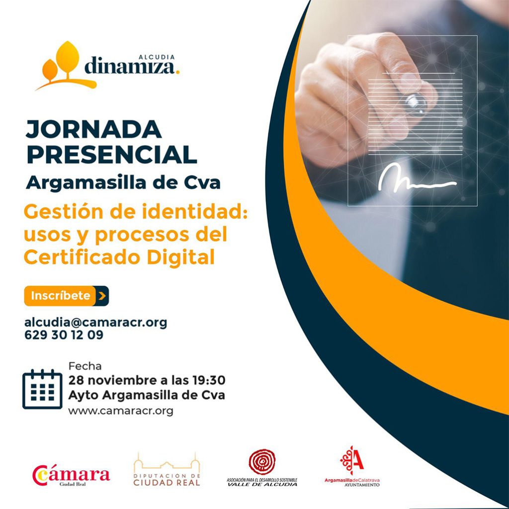 Argamasilla de Calatrava albergará este próximo lunes 28 de noviembre la jornada presencial ‘Gestión de identidad: usos y procesos del certificado digital’, promovido por el servicio Dinamiza Alcudia de la Cámara de Comercio de Ciudad Real y la Diputación. Convocatoria “de máximo interés para nuestro empresariado, sobre todo autónomos y pequeña y mediana empresa porque, […]