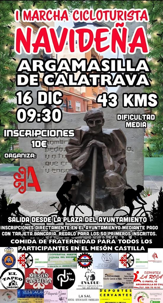 La Concejalía de Deportes del Ayuntamiento de Argamasilla de Calatrava ha organizado para el sábado 16 de diciembre la primera Marcha Cicloturista Navideña, que en su estreno va a ofrecer a sus participantes diferentes alicientes. “Queremos sobre todo que los amantes de este deporte, que somos muchos, nos juntemos por un día, en unas fechas […]