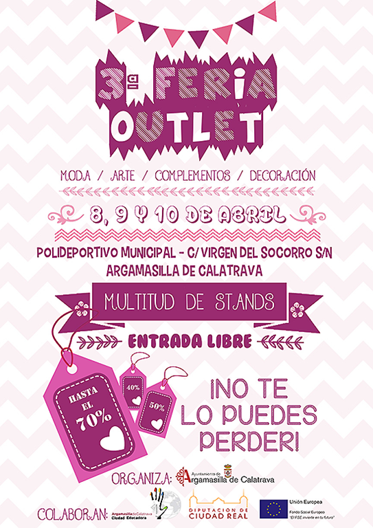 imageEl Ayuntamiento de Argamasilla de Calatrava, a través de su Concejalía de Empleo y Desarrollo Empresarial, trabaja ya en la organización de la III Feria de Outlet, prevista para los días 8, 9 y 10 del próximo mes de abril. La principal novedad este año radicará en su cambio de emplazamiento.
