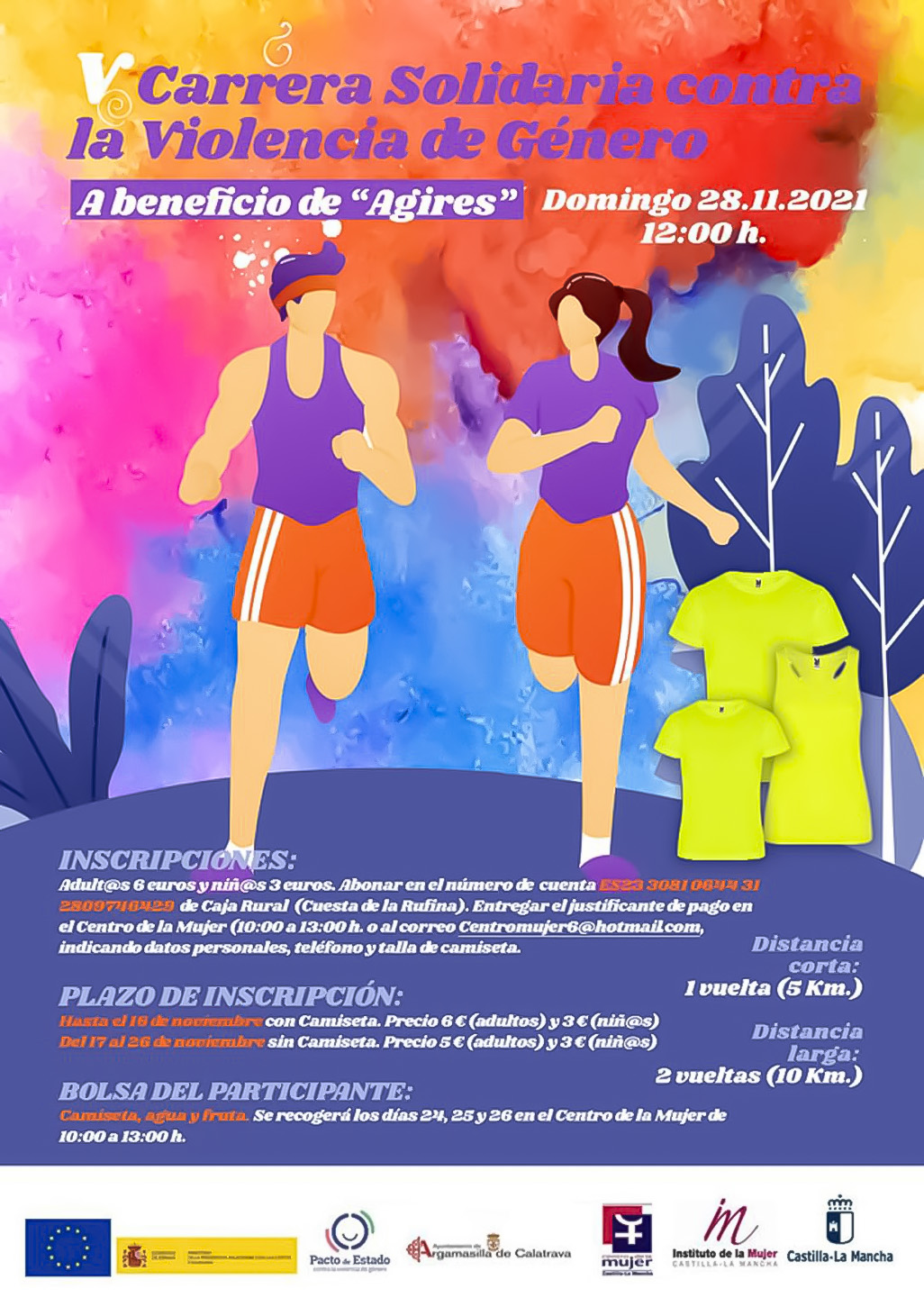 El Ayuntamiento de Argamasilla de Calatrava, a través de su Concejalía de Igualdad, organiza la V Carrera Solidaria contra la Violencia de Género que tendrá lugar el domingo 28 de noviembre desde las 12:00 horas en el Parque ‘Huerta Asaura’, sobre dos distancias de 10 y de 5 kilómetros urbanos y a beneficio del colectivo AGIRES.