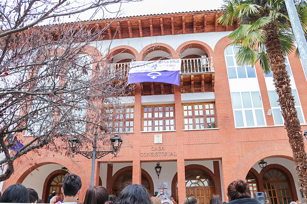El acto ha tenido lugar al mediodía en la Plaza del Ayuntamiento, frente al edificio consistorial que estos días preside en su balconada una gran pancarta reivindicativa del 8M, y ante varias decenas de personas de ambos sexos que han secundado la cita.