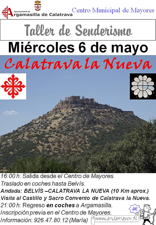El próximo miércoles 6 de mayo los mayores de la localidad aficionados a las caminatas tienen una nueva cita en el programa de senderismo, que concluirá en este caso en Calatrava la Nueva. Se trata de un recorrido cómodo, de 10 kilómetros aproximadamente, por lo que resulta aconsejable para todo aquel que desee disfrutar de la naturaleza, aprovechando las buenas temperaturas actuales.