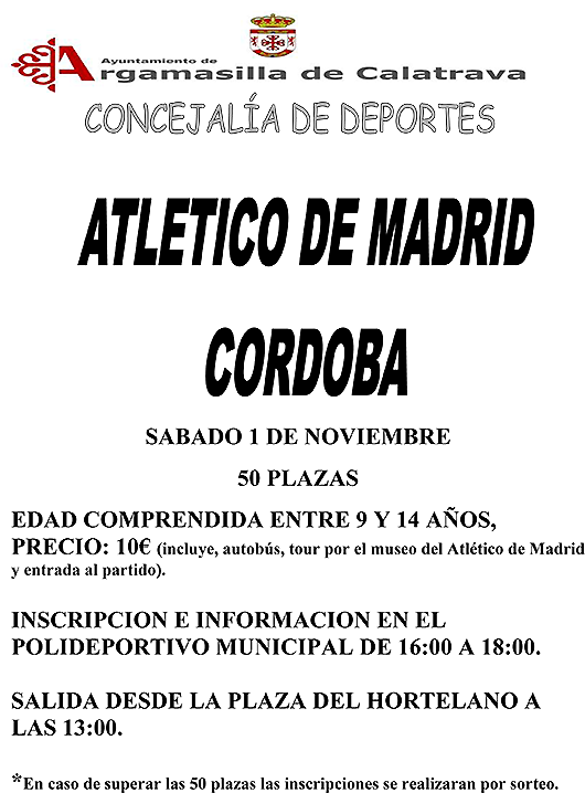 El ayuntamiento de Argamasilla de Calatrava, a través de la concejalía de deportes, sigue promocionando la afición por el deporte entre los más pequeños, con diversas iniciativas. En este caso la propuesta es una excursión a Madrid para niños de entre 9 y 14 años, pertenecientes a las escuelas deportivas de la localidad, para disfrutar del partido que disputarán el día 1 de noviembre el Atlético de Madrid y el Córdoba.