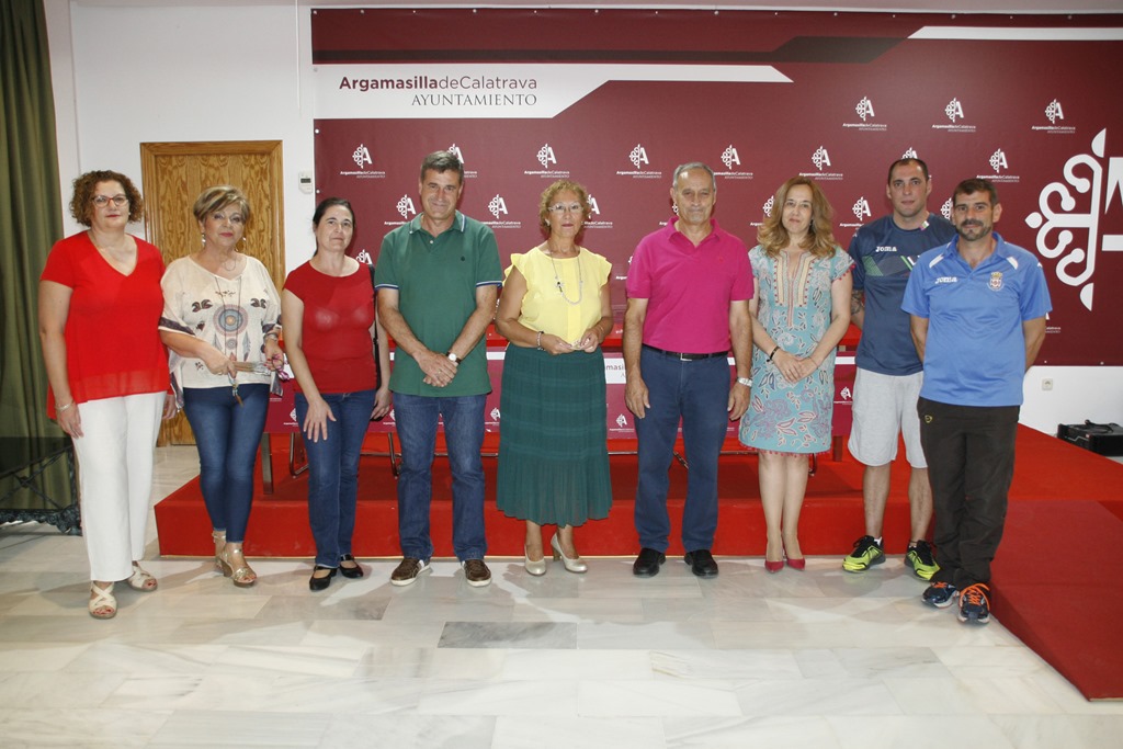 20160825 Foto de familia de los participantes en la entrega del donativo a la AECC rabaneraEl Club de Veteranos de Argamasilla de Calatrava ha entregado a la Asociación Española contra el Cáncer de la localidad 551 euros, recaudados en un partido benéfico disputado hace algo menos de un mes contra el Málaga Club de Futbol. La alcaldesa, Jacinta Monroy, presente en el acto de entrega, afirmó sentirse orgullosa de que “Argamasilla una vez más es ejemplo de solidaridad”