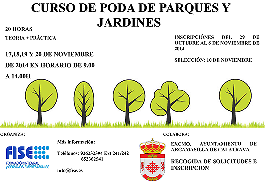 En este caso el consistorio, colabora en la organización de un curso de: “Poda de Jardines”, impartido por la empresa FISE (Formación Integral y Servicios Empresariales). Que constará de 20 horas de duración.