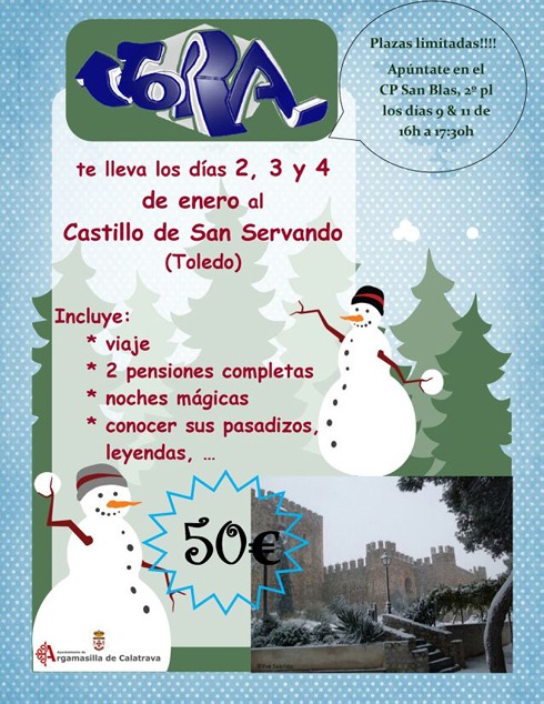 Las personas interesadas en participar pueden formalizar su inscripción en el colegio público San Blas del 9 al 11 de diciembre de 16 a 17:00. El precio es de 50 euros e incluye los desplazamientos, dos pensiones completas, rutas para conocer los pasadizos de Toledo y estancia en el Albergue juvenil Castillo de San Servando, ubicado en lo alto de la ciudad y desde el que se pueden disfrutar de unas magníficas vistas de la misma.