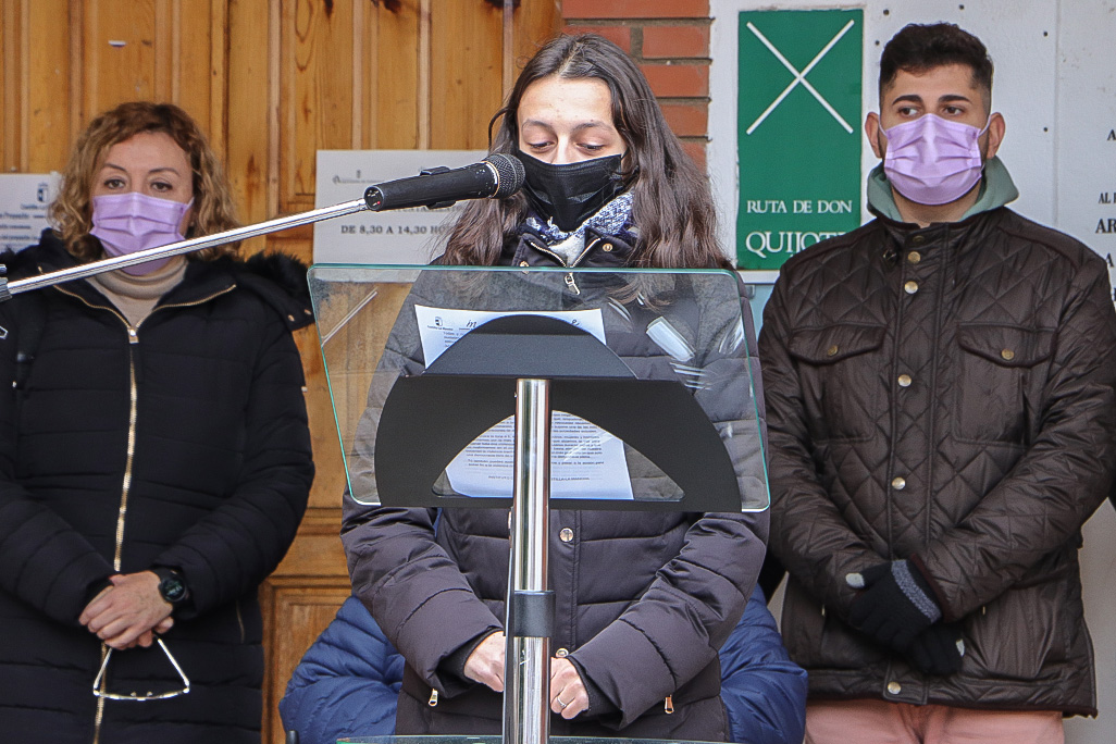 A continuación, ha puesto su voz al manifiesto regional por el Día de la Mujer la alumna del IES ‘Alonso Quijano’ Beatriz Patiño, que forma parte del Proyecto ‘Libres’ que el Ayuntamiento lleva a cabo en el recinto docente por mediación del Centro de la Mujer.