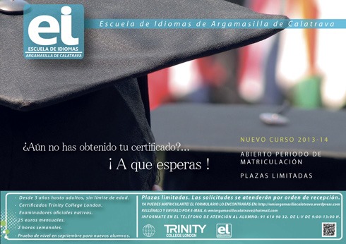 La Escuela de Idiomas de Argamasilla de Calatrava se prepara para iniciar el nuevo curso escolar de 2.013 – 2.014 a partir del próximo dos de octubre con una programación de cursos que abarca desde infantil hasta el nivel b1 para los adultos. Las plazas son limitadas y actualmente hay inscritos ya más de 100 alumnos, entre los que se incluyen aquellos que quieren consolidar su nivel de inglés, después de que en las últimas pruebas oficiales convocadas del Trinity College London se lograra un nivel de aprobados de más del 70%.