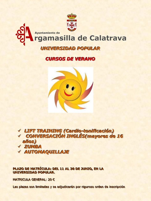 Nuevas propuestas formativas en los cursos de verano de la Universidad Popular de Argamasilla de CalatravaLa programación de la Universidad Popular de Argamasilla de Calatrava sigue ofreciendo cursos novedosos, así como otros que han tenido gran acogida, para los próximos meses de verano. El plazo de inscripción en los mismos estará abierto desde el 11 hasta el 30 de junio, en la sede de la Universidad Popular y desde el ayuntamiento se anima a todos los rabaneros a que participen en las actividades que se proponen, que aúnan ocio y formación, además de la posibilidad de compartir experiencias.