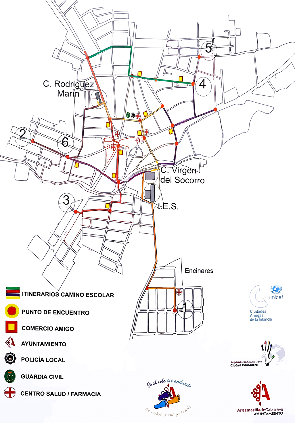 Las rutas para alcanzar el CEIP ‘Virgen del Socorro’ parten a las 8,35 horas, una parte de calle Encina, hacia Encinares y rotonda; otra es de la rotonda en calle Almodóvar, por calle Sol, pasando por el Botijo; y la última desde el Polideportivo, por Plaza Santos Mártires y calles Torillo y Forraje.